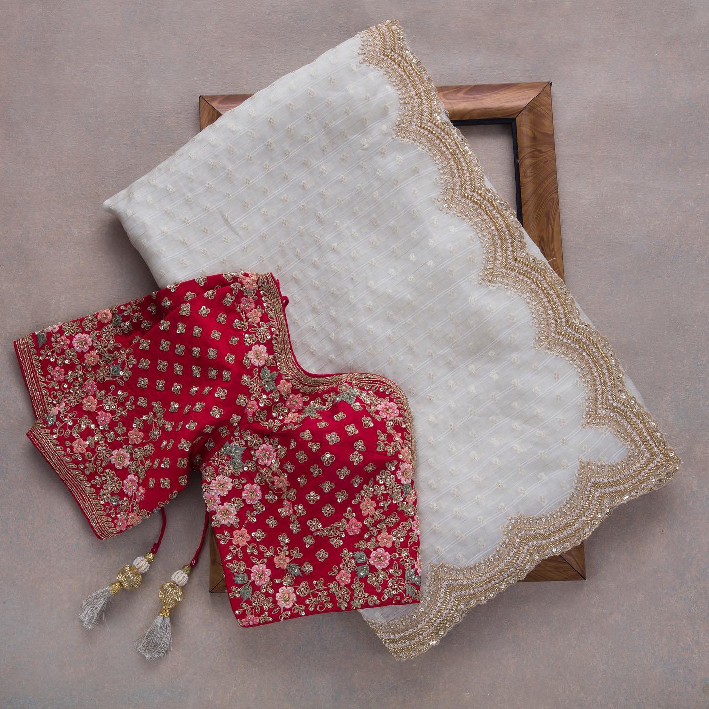 Material : Silk Pattern : All over Saree Color : White And Red Saree Fabric : Silk Saree length : 5.5 Mtrs Saree type: Embroidery Blouse Fabric : Silk Blouse Length : 0.80m