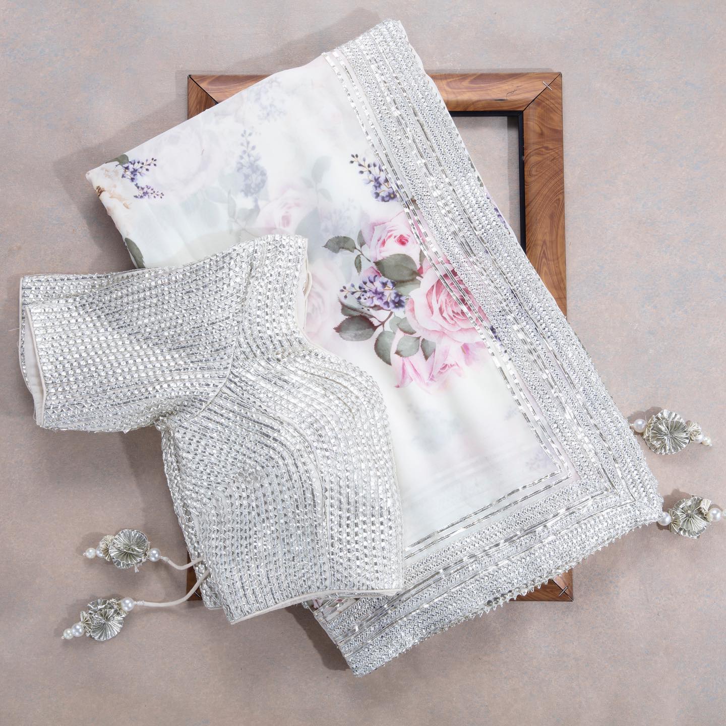 White Flower Rangoli Silk Sequence Embroidery Work Saree With Blouse