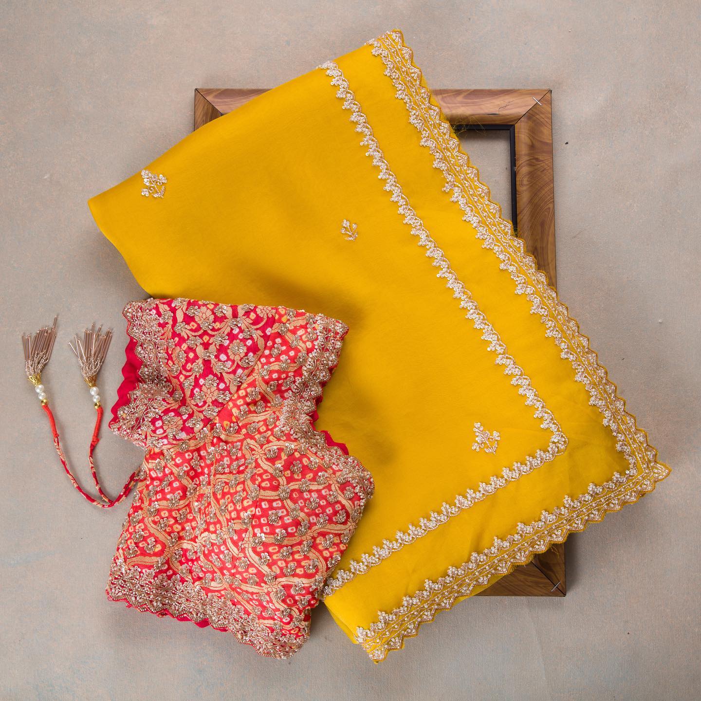 Material : Silk Pattern : All over Saree Color : Yellow and Red Saree Fabric : Silk Saree length : 5.5 Mtrs Saree type: Embroidery Blouse Fabric : Silk Blouse Length : 0.80m