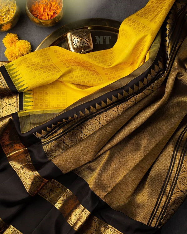Buy Yellow and Black Kanchipuram Silk Saree with Attached Blouse